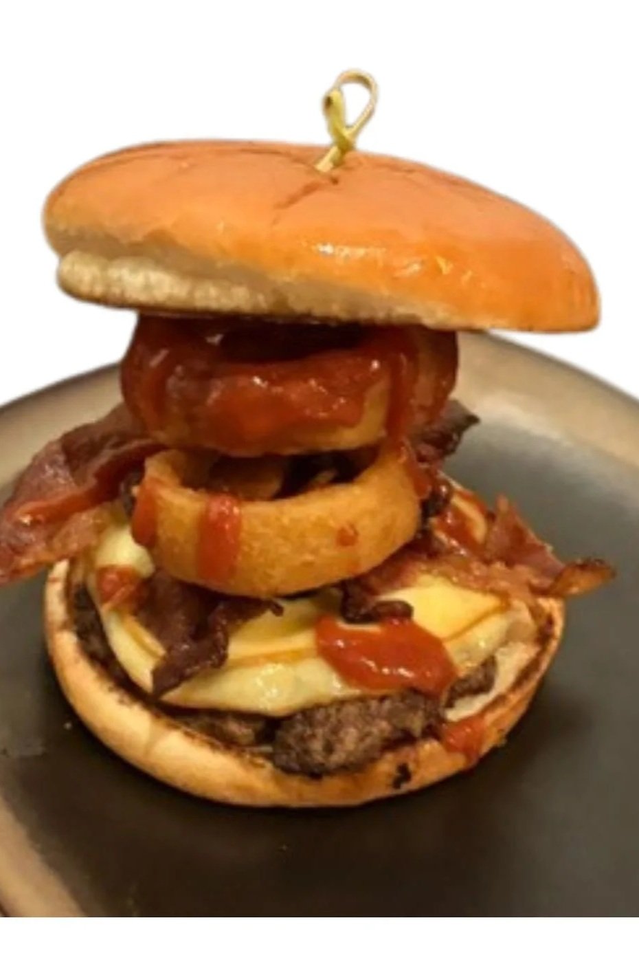 Onion rings, tomato jam, smoked Gouda, smokey BBQ sauce, bacon.