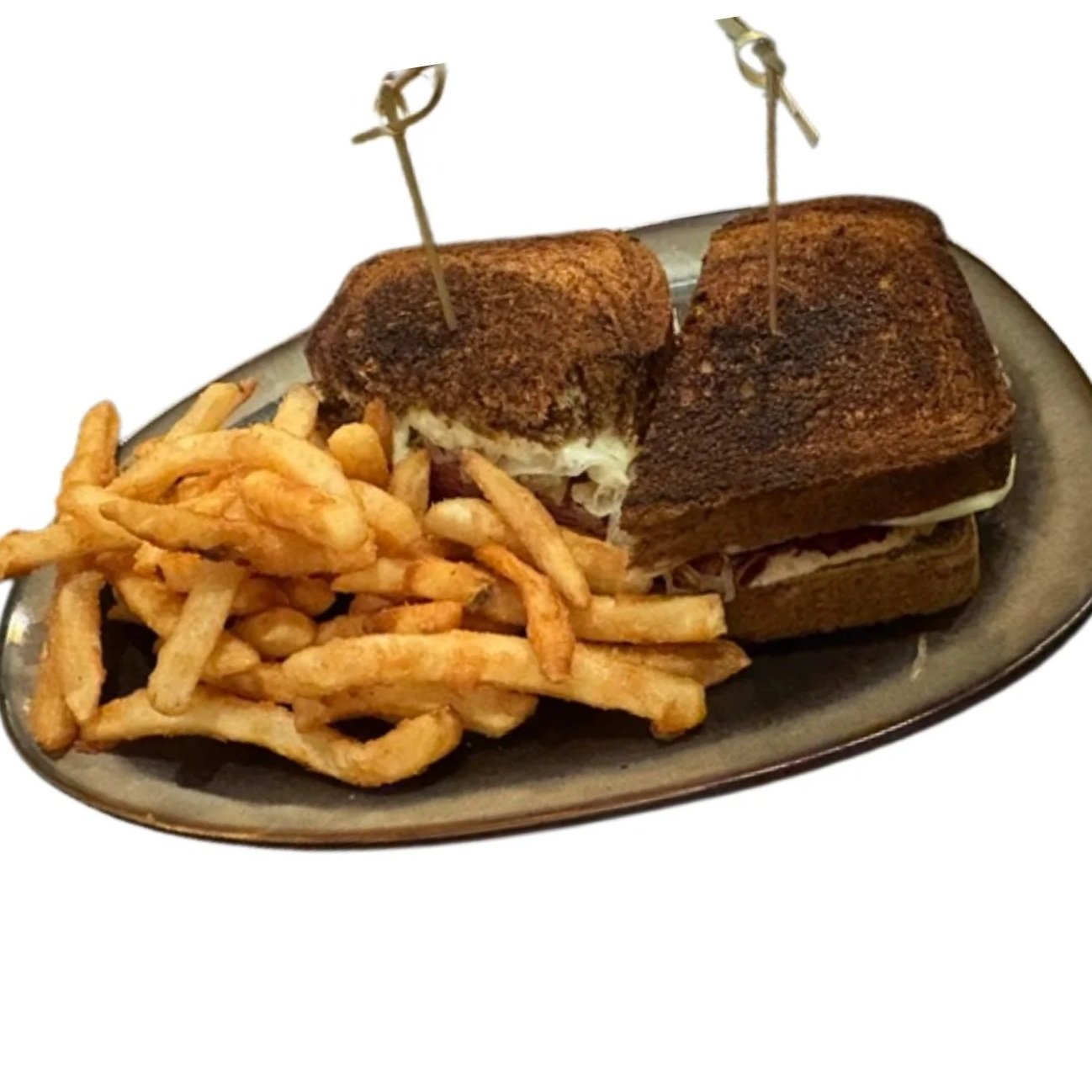 Rye bread topped with sauerkraut, melty Swiss American cheese, house Reuben dressing, and smokey pastrami.
